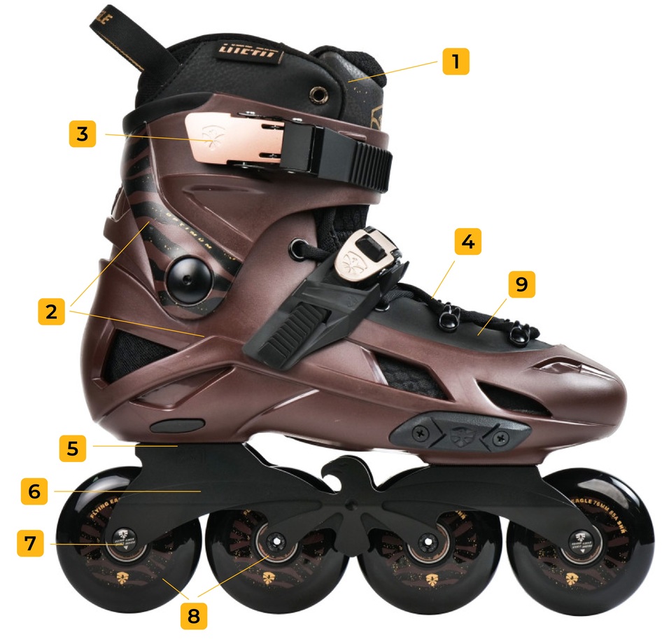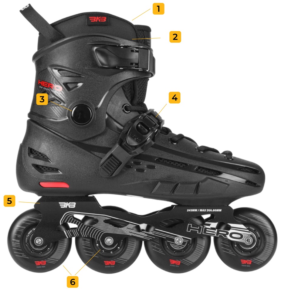 - Rolki freeskate mają twardy but wewnętrzny z tworzywa sztucznego, dzięki czemu zapewniają lepszą stabilizację i wytrzymałość.